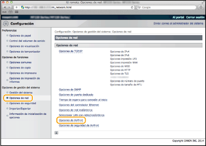 Iniciar sesión a la IU remota en el modo Administrador del sistema ( Inicio de la IU remota)  [Configuración]  [Opciones de red]  [Opciones de TCP/IP]  [Opciones de impresión IPP]  [Editar...]  borrar o seleccionar la casilla de verificación [Usar impresión IPP]  [Aceptar]