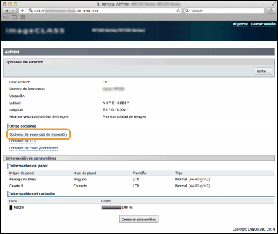 Haga clic en Opciones de seguridad de impresión en la pantalla para AirPrint