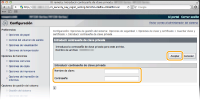 Introduzca el nombre del par de claves y la contraseña y, a continuación, haga clic en [Aceptar].