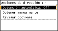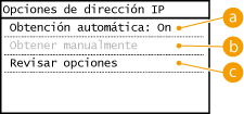 ![]() Si aparece <On>, pulse <Obtención automática> y establezca tanto <Seleccionar protocolo> como <IP automática> en <Off>.