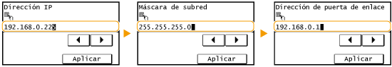 <Máscara de subred> <Dirección de puerta de enlace>.Introduzca cada uno de los valores utilizando las teclas numéricas y pulse <Aplicar>.