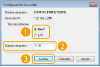 Haga clic en el botón de opción [LPR] o [RAW] en [Tipo de protocolo], cambie el número en el cuadro de texto [Número de puerto] según sea necesario y, a continuación, haga clic en [Aceptar].