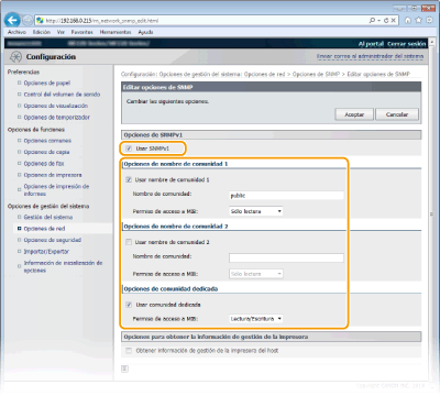 Seleccione la casilla de verificación [Usar nombre de comunidad 1] o [Usar nombre de comunidad 2], introduzca el nombre de la comunidad en el cuadro de texto [Nombre de comunidad] y especifique la opción [Permiso de acceso a MIB].