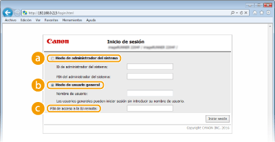 Puede realizar todas las operaciones de IU remota y configurar todos las opciones. Introduzca la ID apropiada en [ID de administrador del sistema] y el PIN en [PIN del administrador del sistema] (