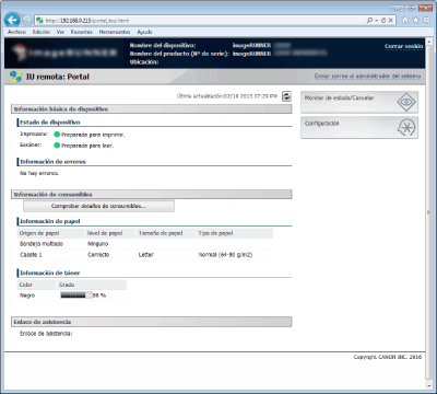 Para utilizar el equipo de forma remota, debe introducir la dirección IP del equipo en un navegador web e iniciar la IU remota. Compruebe la dirección IP establecida en el equipo previamente (
