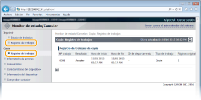 Aparece el historial de impresiones o copias. Puede ver los últimos 50 trabajos.