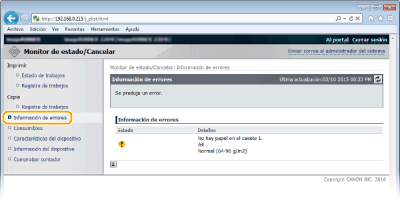 Cuando se produce un error, esta página aparecerá haciendo clic en el mensaje que aparece debajo de [Información de errores] en la página del portal (página principal).