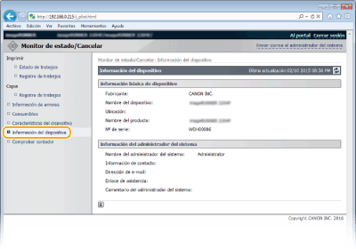 Se muestra la información sobre el equipo y el administrador del sistema. Esta información está establecida en [Gestión del sistema] en la página [Configuración].