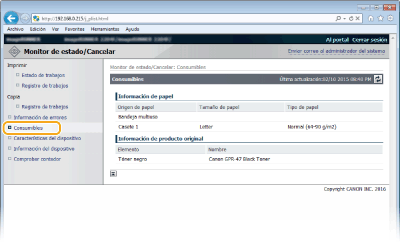 También podrá hacer clic en [Comprobar detalles de consumibles...] en la Página del portal (página principal) para visualizar la pantalla de comprobación de los consumibles.
