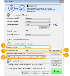 ), [Guardar la imagen escaneada en] cambia a [Crear archivo PDF basado en]. En este caso, especifique un archivo PDF existente en el que desee añadir los datos de documento recientemente escaneados. Los datos se añaden al archivo existente como páginas adicionales (Adición de páginas a un archivo PDF existente).