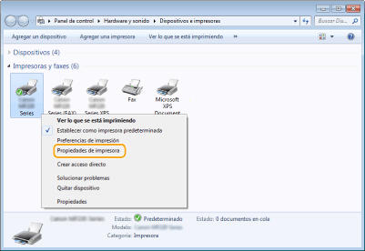 Haga clic con el botón derecho del ratón en el icono de impresora y haga clic en [Propiedades de impresora].