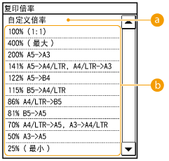 通过使用<A5>→<A4>等预设复印倍率,或者通过以 1% 为增量设置自定义复印倍率,可以放大或缩小复印件。