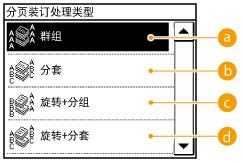 准备多个多页文档副本时,可为副本纸张的顺序选择<群组>、<分套>、<旋转+分组>或<旋转+分套>。此功能在准备会议或演讲的分发材料时很有用。