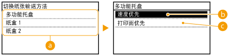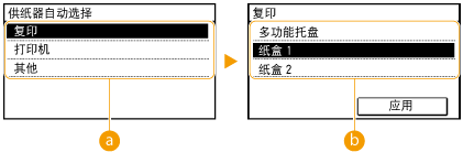 )上选择了<打印机>,将不显示<多功能托盘>。打印从多功能托盘送入的纸张时,始终启用自动纸盒选择功能。