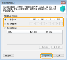 ![]() ![]() 如果未检测到本机 单击 [刷新]。如果问题仍然存在,请单击 [IP 地址] 或 [MAC 地址],输入本机的 IP 地址或 MAC 地址查看网络设置,然后单击 [下一步]。