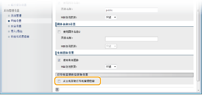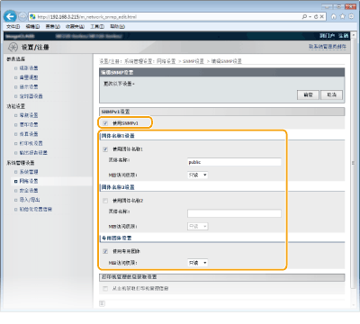 选择 [使用团体名称1:] 或 [使用团体名称2:] 复选框,在 [团体名称] 文本框中输入团体名称,然后指定 [MIB访问权限:] 设置。