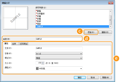 单击各选项卡指定水印的文本、颜色或打印位置。更多信息,请单击打印机驱动程序画面上的 [帮助]。