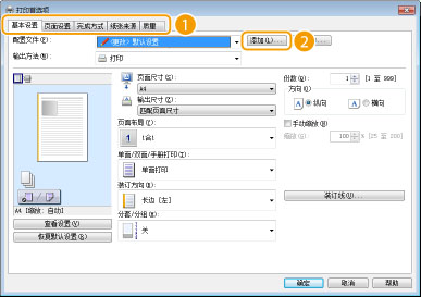 根据 [基本设置]、[页面设置]、[完成方式] 和 [质量] 选项卡上的需要进行打印设置。