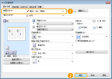 每次打印时指定设置组合,例如“以节省墨粉模式在 A4 尺寸的纸张上以单面横向打印”,可能很耗时。如果您将常用打印设置组合注册为“配置文件”,则只需从列表中选择其中一个配置文件,即可指定打印设置。本节说明了如何注册配置文件,以及如何使用配置文件进行打印。