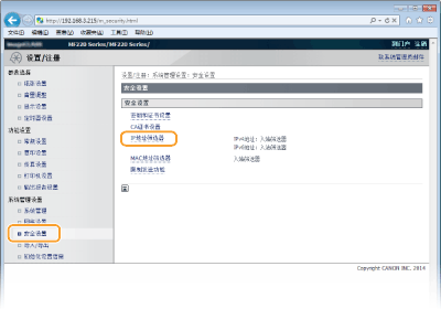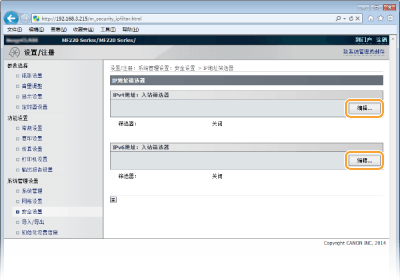 如果错误输入 IP 地址,则可能无法从远程用户界面访问本机,此时需要将 <IPv4地址筛选器> 或 <IPv6地址筛选器> 设置为 <关闭>。 IPv4地址筛选器 IPv6地址筛选器