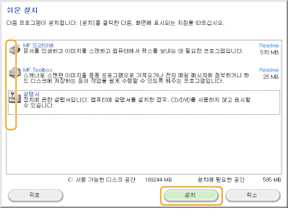 [설명서]를 제외한 모든 확인란의 선택을 해제하고 [설치]를 클릭합니다.