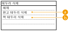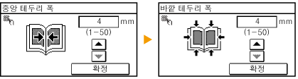 출력 용지 크기보다 작은 문서를 복사하면 복사한 이미지 주위에 프레임 선이 나타날 수 있습니다. 두꺼운 책의 페이지를 복사하면 진한 테두리가 나타날 수 있습니다. <테두리 삭제>를 사용하여 이러한 프레임 선과 진한 테두리를 지울 수 있습니다.