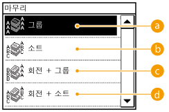 다중 페이지 문서의 다중 복사본을 준비할 때 복사본을 페이지 순서대로 정렬하려면 <그룹>, <소트>, <회전 + 그룹> 또는 <회전 + 소트>를 복사한 페이지의 순서로 선택할 수 있습니다. 이 기능은 회의나 프레젠테이션용 인쇄물을 준비할 때 유용합니다.
