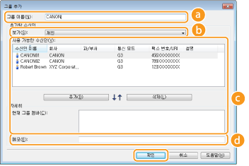 그룹 다이얼에 등록할 수신인을 선택하고 [추가]를 클릭합니다. 선택한 수신인이 [현재 그룹 멤버]에 표시됩니다.
