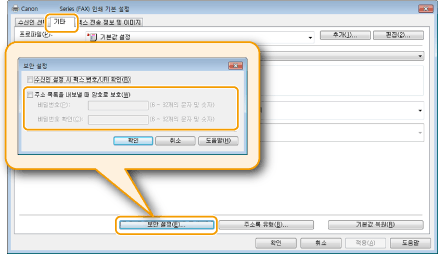 [기타] 탭의 [보안 설정]을 클릭하면 표시되는 대화 상자에서 [주소 목록을 내보낼 때 암호로 보호]를 선택한 경우, [내보내기]를 클릭하면 비밀번호를 입력하는 대화 상자가 표시됩니다. 자세한 내용을 보려면 팩스 드라이버 화면에서 [도움말]을 클릭하십시오.