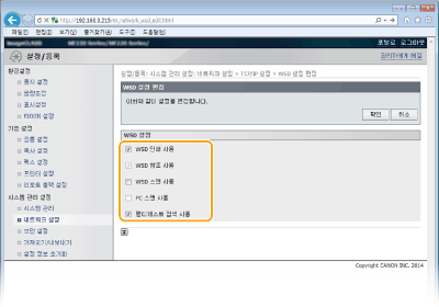 WSD를 통해 인쇄하려면 확인란을 선택합니다. WSD 인쇄를 사용하지 않을 경우 확인란 선택을 해제합니다. [WSD 참조 사용]