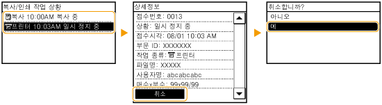 리모트 UI에서 취소리모트 UI의 [인쇄: 작업 상황] 페이지에서 인쇄를 취소할 수 있습니다: 인쇄 문서의 현재 상태 확인