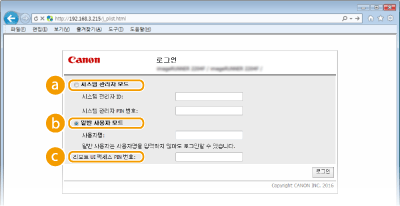 모든 리모트 UI 조작을 수행하고 모든 설정을 구성할 수 있습니다. [시스템 관리자 ID]에 해당 ID를 입력하고 [시스템 관리자 PIN 번호]에 PIN을 입력합니다 (
