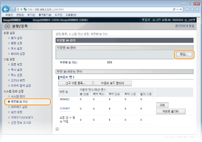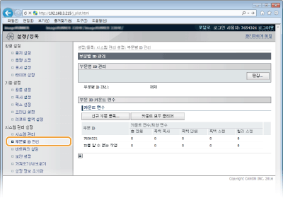 [부문 ID 카운트 면수]각 부서 ID에 대해 복사, 인쇄, 스캔 또는 팩스 전송에 사용된 총 페이지 수를 확인할 수 있습니다.