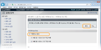 컴퓨터에서 인쇄하거나 팩스를 전송할 때마다 [부서 ID/PIN 확인] 팝업 화면을 표시하려면 확인란을 선택합니다. [디바이스에서 부서 ID/PIN 인증]