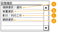 時,將顯示畫面,可讓您檢查列印文件的狀態,以及碳粉存量等本機狀態或本機 IP 位址等網路設定資訊。