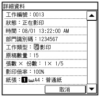 顯示所選項目的目前狀態。下圖以 <影印/列印工作狀態> 畫面為例說明。