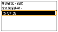 發生錯誤時,在某些情況下,會顯示如何回應錯誤的指示。請遵循畫面上的指示解決問題。下圖以發生卡紙時顯示的畫面為例說明(