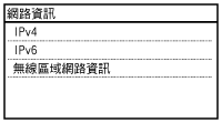 顯示本機 IP 位址等網路設定,以及無線區域網路通訊狀況等狀態。