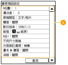 時顯示的設定。如果您將這些預設設定變更為符合經常執行的操作,可以省去每次影印時指定相同設定的操作。