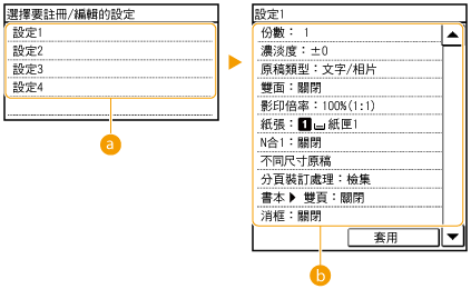 <常用設定> <刪除> 選擇設定 <是>。若要使用已註冊的設定,按 <影印>