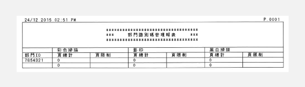 啟用部門識別碼管理時,您可列印報表以查看各部門識別碼已影印、列印及掃描的總頁數。報表可讓您監控使用量並改善管理。