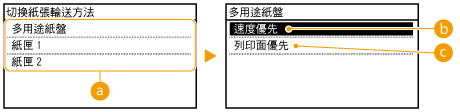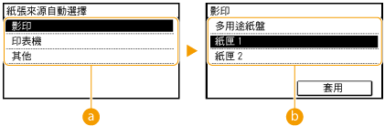 )選擇 <印表機>,不會顯示 <多用途紙盤>。在從多用途紙盤中裝入的紙張上列印時,總是啟用自動選擇紙匣。