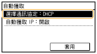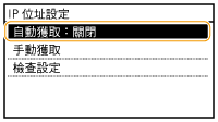 ![]() ![]() 若無須使用 DHCP/BOOTP/RARP 指定 IP 位址 選擇 <關閉>。如果在無法使用 <DHCP>、<BOOTP> 或 <RARP> 時選擇這些服務,本機將浪費時間和通訊資源在網路上搜尋這些服務。 |