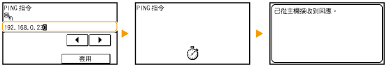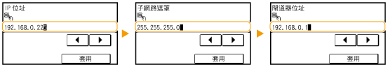 <子網路遮罩> <閘道器位址>。使用數字鍵輸入各個設定,然後點選 <套用>。