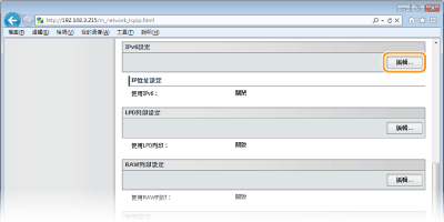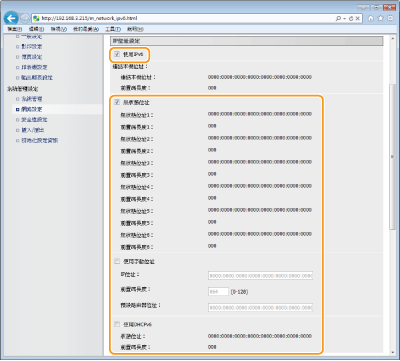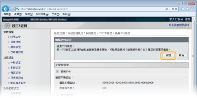 可以透過遠端使用者介面設定本機的 IPv6 位址。設定 IPv6 位址前,請檢查 IPv4 位址設定(檢視 IPv4 設定)。必須指定正確的 IPv4 設定,才能使用 IPv6 位址。請注意,使用掃描器驅動程式或 MF Toolbox 的掃描功能不適用於 IPv6 環境。本機最多可以使用以下九個 IPv6 位址: