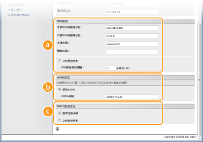 勾選此核取方塊可在每次變更本機 IP 位址時動態更新 DNS 記錄。指定更新間隔時,在 [DNS動態更新間隔:] 文字框中輸入時間(以小時為單位)。 [mDNS設定][使用mDNS]