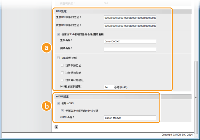 勾選此核取方塊可使用與 IPv4 相同的 mDNS 名稱。若要設定不同的名稱,清除此核取方塊,並在 [mDNS名稱:] 文字框中輸入 mDNS 名稱。 |