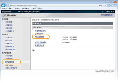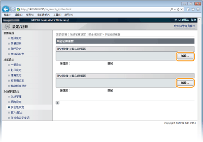 如果輸入錯誤的 IP 位址,可能無法從遠端使用者介面存取本機,在此情況下必須將 <IPv4位址篩選器> 或 <IPv6位址篩選器> 設為 <關閉>。 IPv4位址篩選器 IPv6位址篩選器