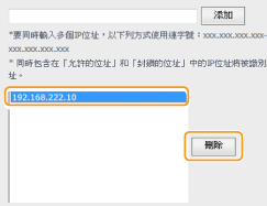 僅允許與已在 [允許的位址] 中註冊其 IP 位址的裝置通訊(接收)並限制與具有任何其他 IP 位址的裝置通訊。但是,對於同樣註冊於 [封鎖的位址] 中的 IP 位址,通訊亦會受限。