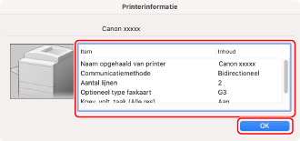 OPMERKINGAls de naam van het stuurprogramma die bovenaan het dialoogvenster [Printerinformatie] wordt weergegeven en de naam die in [Configuratie] > [Naam opgehaald van printer] wordt weergegeven, niet overeenkomen, kunt u de functies van het apparaat mogelijk niet gebruiken. Als dit gebeurt, verwijder dan het apparaat uit [Systeeminstellingen] van macOS en registreer het apparaat opnieuw.